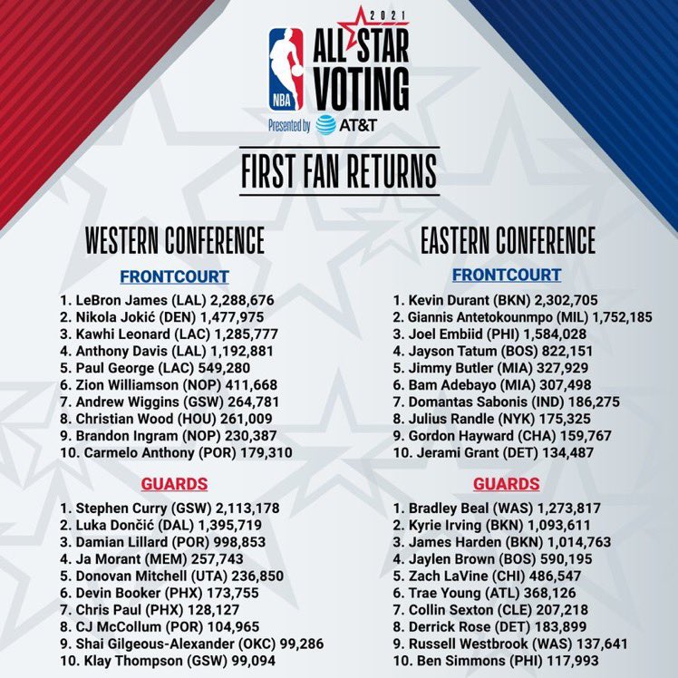 With that in mind here are some takeaways from these results. James 6275459 fan votes and Antetokounmpo 5902286 fan votes led their respective conferences and position groups in fan voting. NBAAllStar 2021 NBAAllStar January 3 2019 Golden States Stephen Curry holds first place among West guards with 793111 votes.
